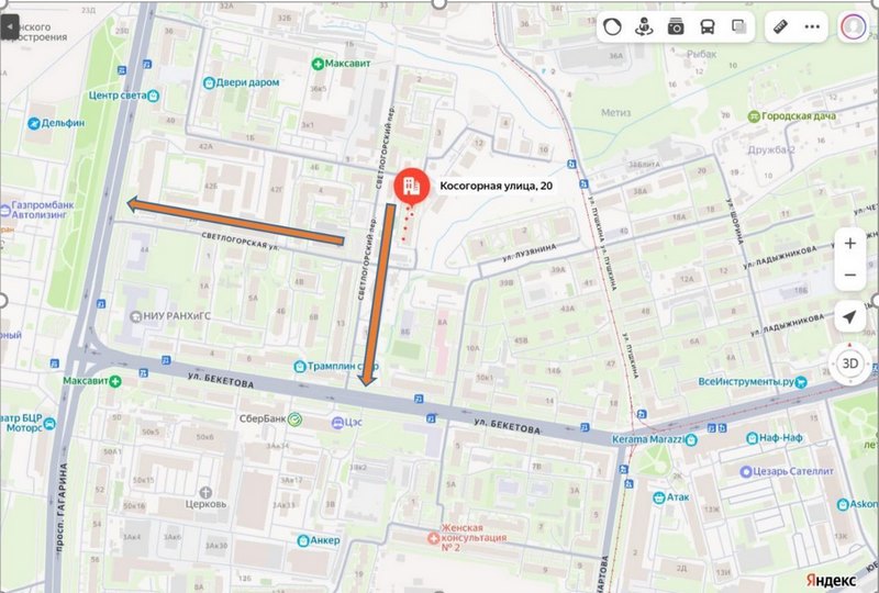Удобный выезд на ул. Бекетова (200м) и на пр. Гагарина (400м), развитая сеть общественного транспорта. Свободный подъезд грузового транспорта, зона разгрузки, парковка