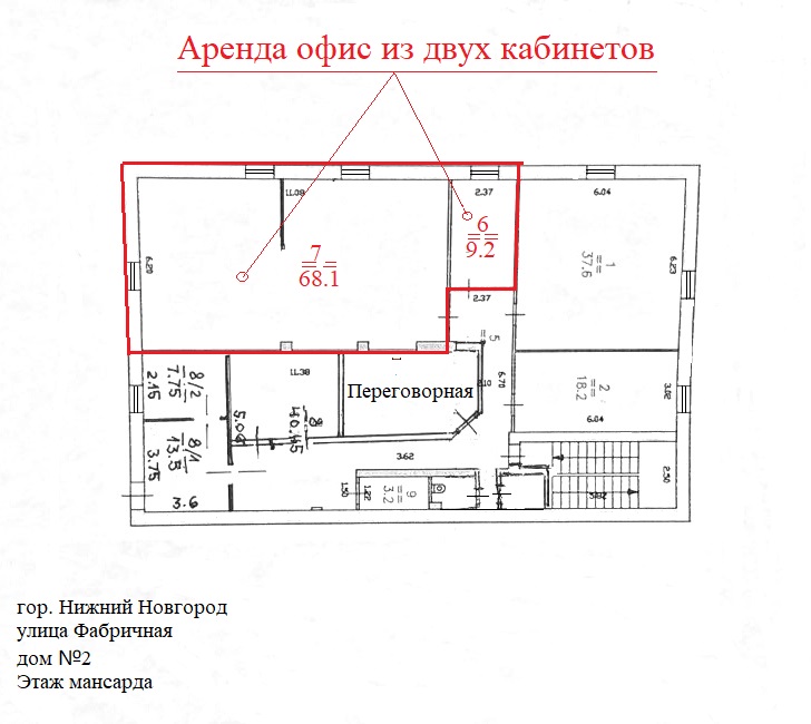Шлиссельбургская ул., д.1. "Аренда помещения в административном здании. Нижний Новгород. Ленинский район. Улица Шлиссельбургская. Общая площадь 90 кв.м. По планировке состоит из трех помещений :23.1 кв.м., 33.5 кв.м. и 32.6 кв.м. Расположено на 1-ом этаже. Общий вход на несколько арендаторов. Санузлы на этаже. Возможно использовать как офис, офис и склад и т.п. Сдается от юр.лица. Ставка аренды без НДС. Дополнительно оплачивается эл.энергия, уборка, отопление (в сезон примерно 8000 рублей в месяц). Рядом со зданием есть парковка для авто. По договору аренды предусмотрен обеспечительный платеж за один месяц.", N106470